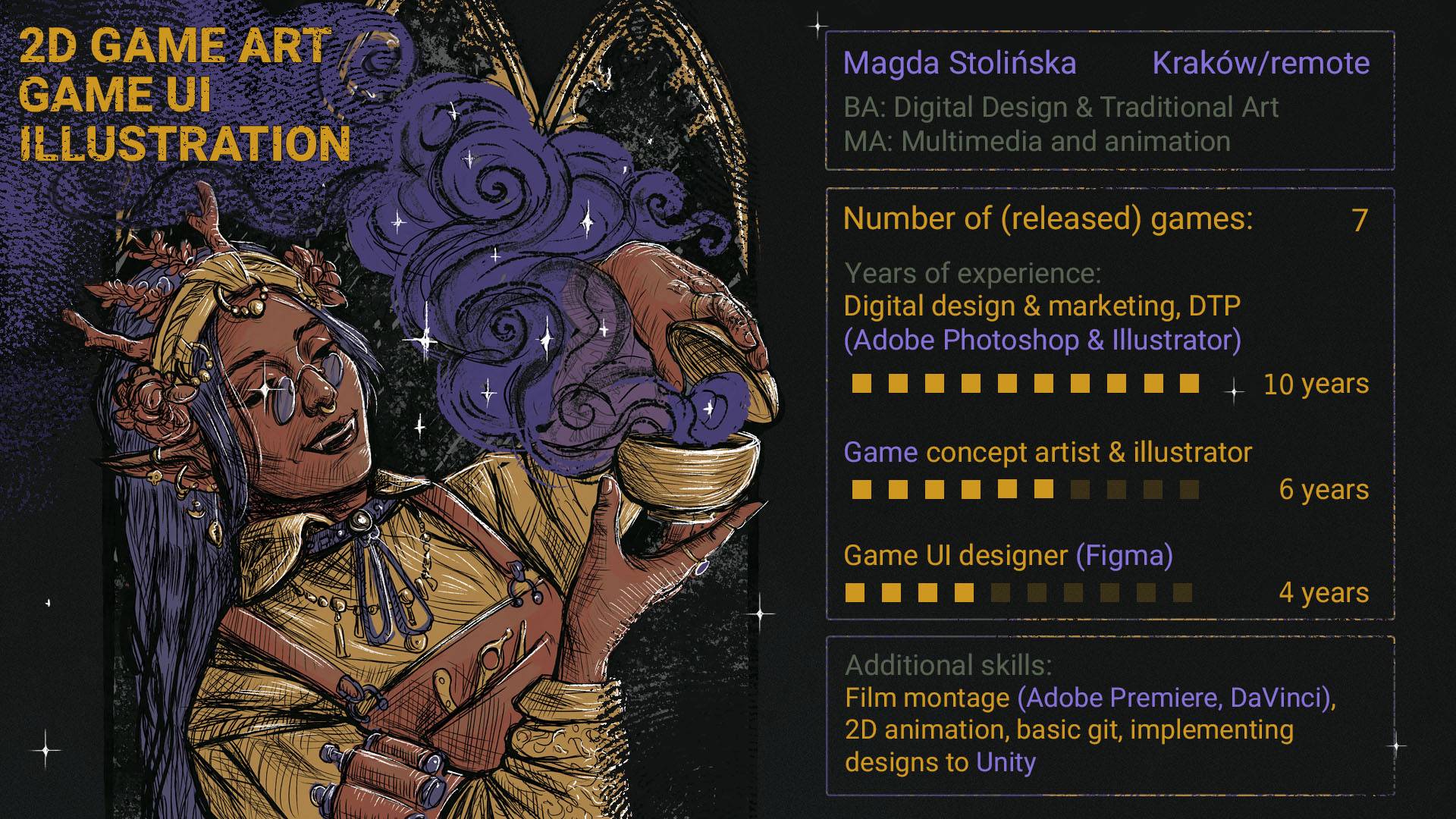 I am a graphic designer with Master’s degree in art. I am trained in traditional art as well as digital art (I still dabble in hand printing, especially linocut and intaglio still inspires my digital illustration). I have worked in my field of expertise for 10 years, at first mostly for e-commerce and advertisement clients, since 2022 I have pursued a career in game developement industry. Nowadays I create user interface workflows and in game assets, as well as logos, key arts and illustration for various games.
